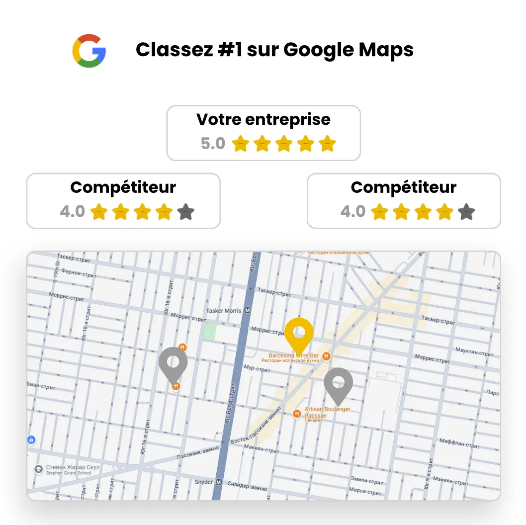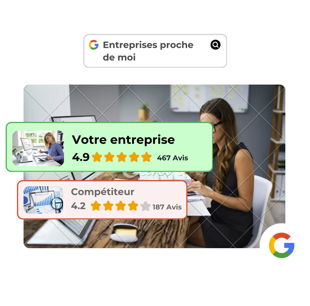 Les avis sur Google améliorent votre réputation en ligne, augmente vos chances d'être vu dans les recherches, construit une confiance avec des clients potentiels, aide à générer du trafic et des ventes pour votre entreprise.